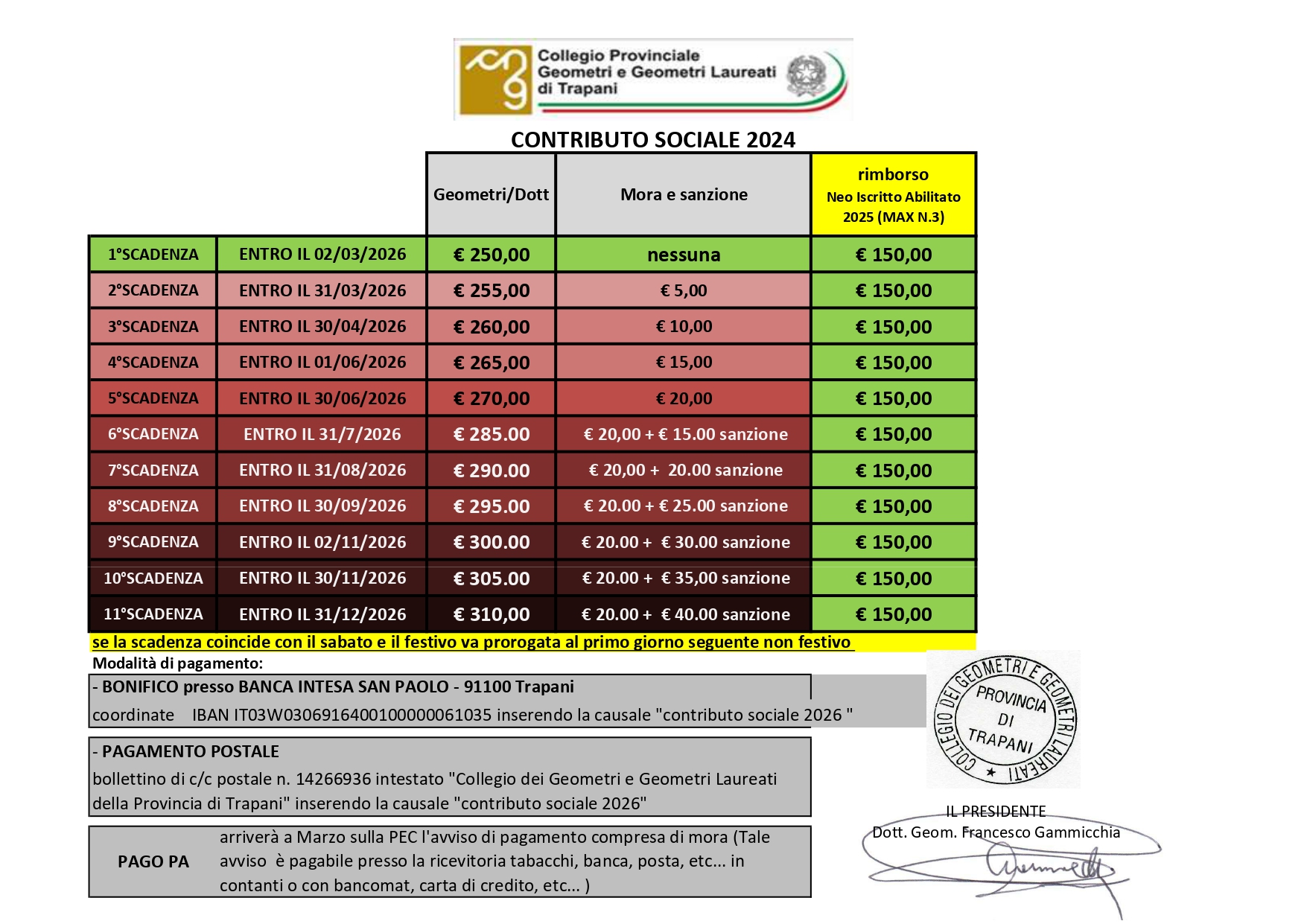 entro il 02/03/2026 l’importo è di €250.00entro il 31/03/2026 l’importo è di 255.00 (perverrà anche il PAGOPA nella propria PEC)- entro il 30/04/2026 l’importo è di 260.00(perverrà anche il PAGOPA nella propria PEC)
