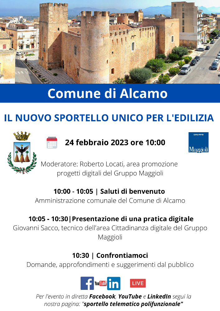 Al fine di far conoscere e illustrare lāaggiornamento del nuovo sportello unico per lāedilizia, il Comune di Alcamo ha organizzato per il giorno venerdƬ 24 del mese di febbraio dalle ore 10:00, un evento da seguire in diretta streaming cosƬ come meglio descritto nella locandina allegata.