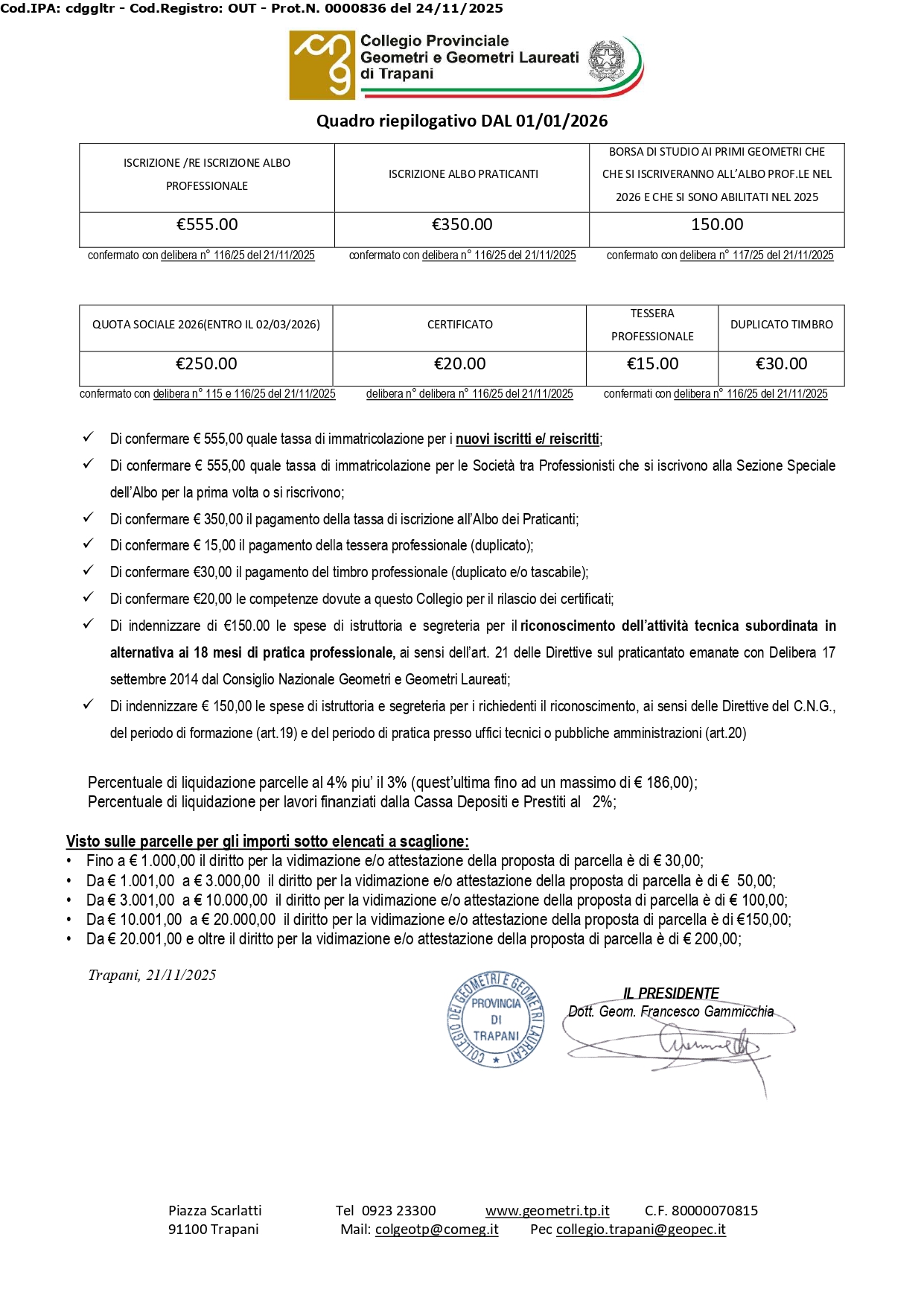 Con delibera 115/25 del 21/11/2025, il Consiglio Direttivo del Collegio ha stabilito l’importo della quota di iscrizione all’Albo ordinaria per l’anno 2026, confermandola in Euro 250,00, comprensivi del contributo al CNGeGL che invece quest'ultimo ha aumentato da €40.00 ad € 60,00