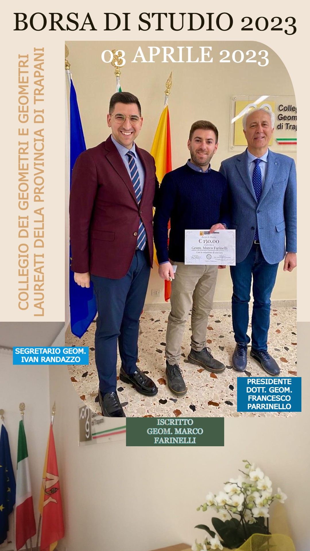 Si è tenuta il 03 Aprile 2023, presso la Sala Consiliare di questo Collegio, la cerimonia di consegna della seconda "borse di studio" istituita dal Consiglio Direttivo del Collegio dei Geometri e Geometri Laureati della Prov. Di Trapani con delibera del 18/11/2022.