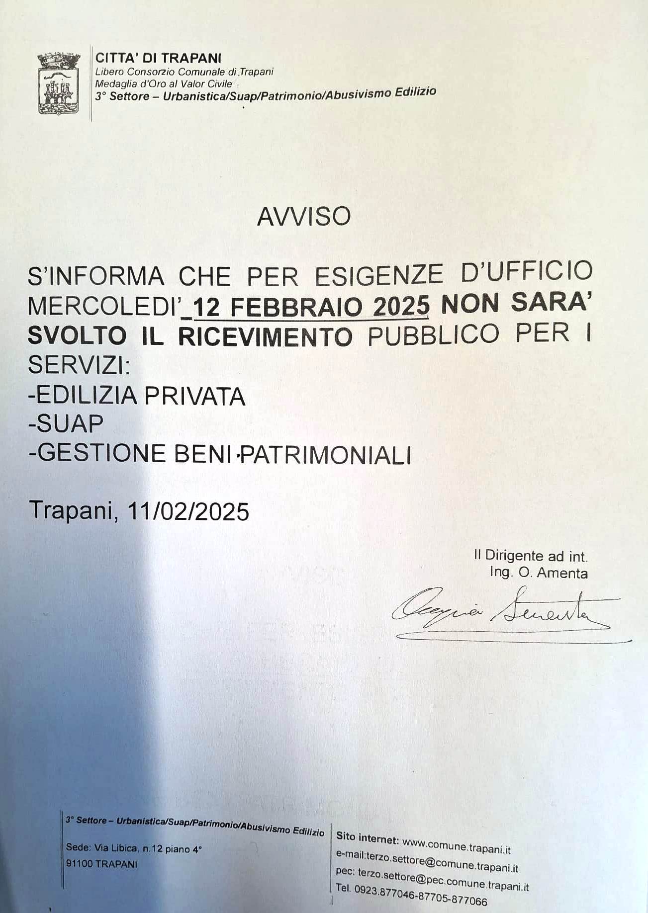 Per esigenze d’ufficio, il Comune di TRAPANI non svolgerà il ricevimento pubblico nella giornata di domani 12 febbraio 2025 per: