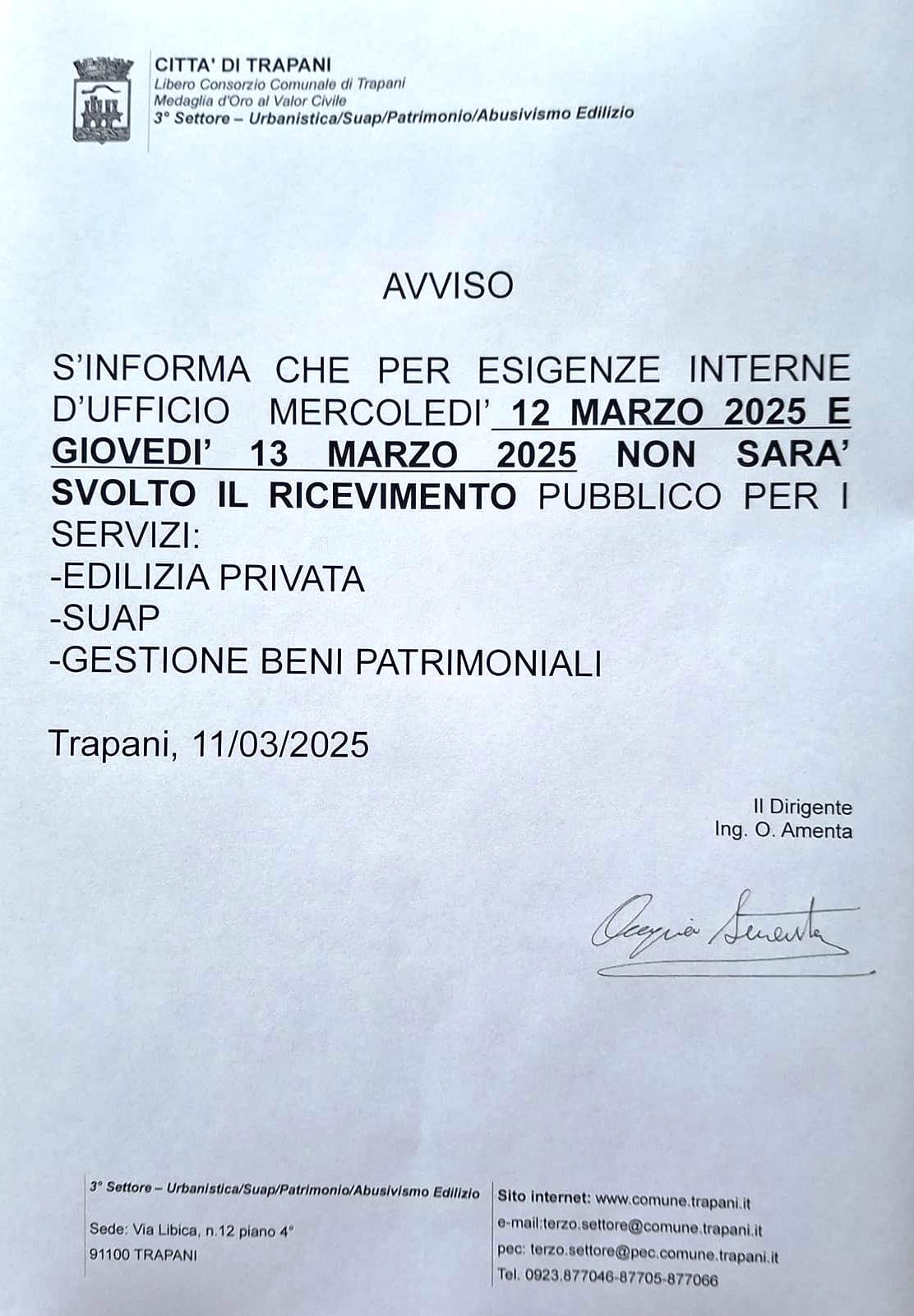 Per esigenze d’ufficio, il Comune di TRAPANI non svolgerà il ricevimento pubblico nella giornata del 12 e 13 marzo 2025 2025 per: