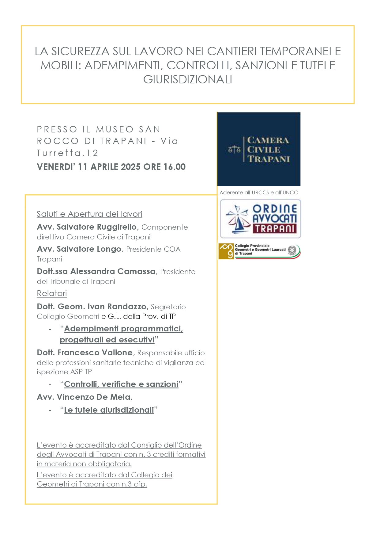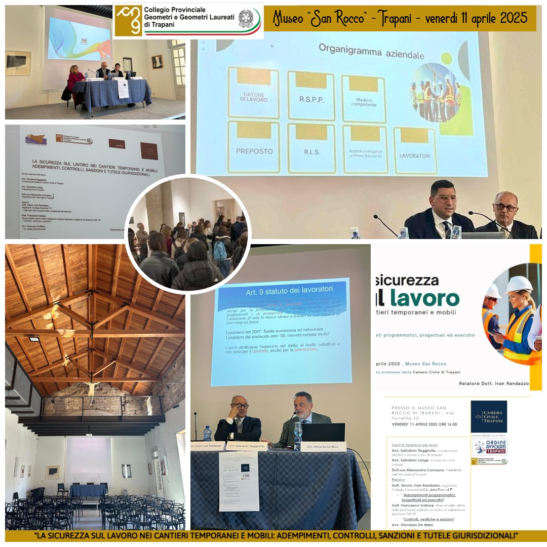 Si è svolto venerdì 11 aprile 2025, presso il prestigioso Museo “San Rocco” di Trapani, l’evento formativo dal titolo “La Sicurezza sul Lavoro nei Cantieri Temporanei e Mobili: Adempimenti, Controlli, Sanzioni e Tutele Giurisdizionali”, promosso dalla Camera Civile di Trapani.