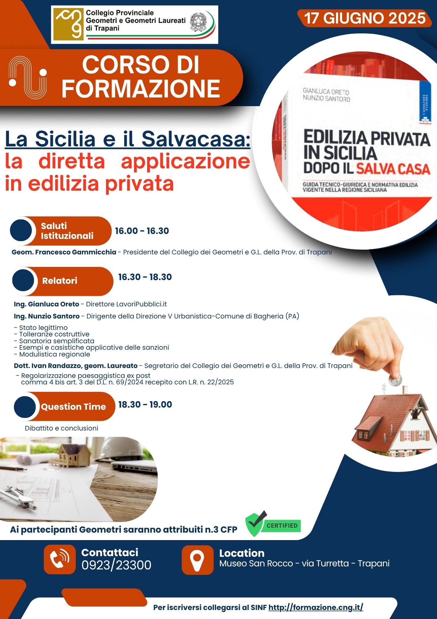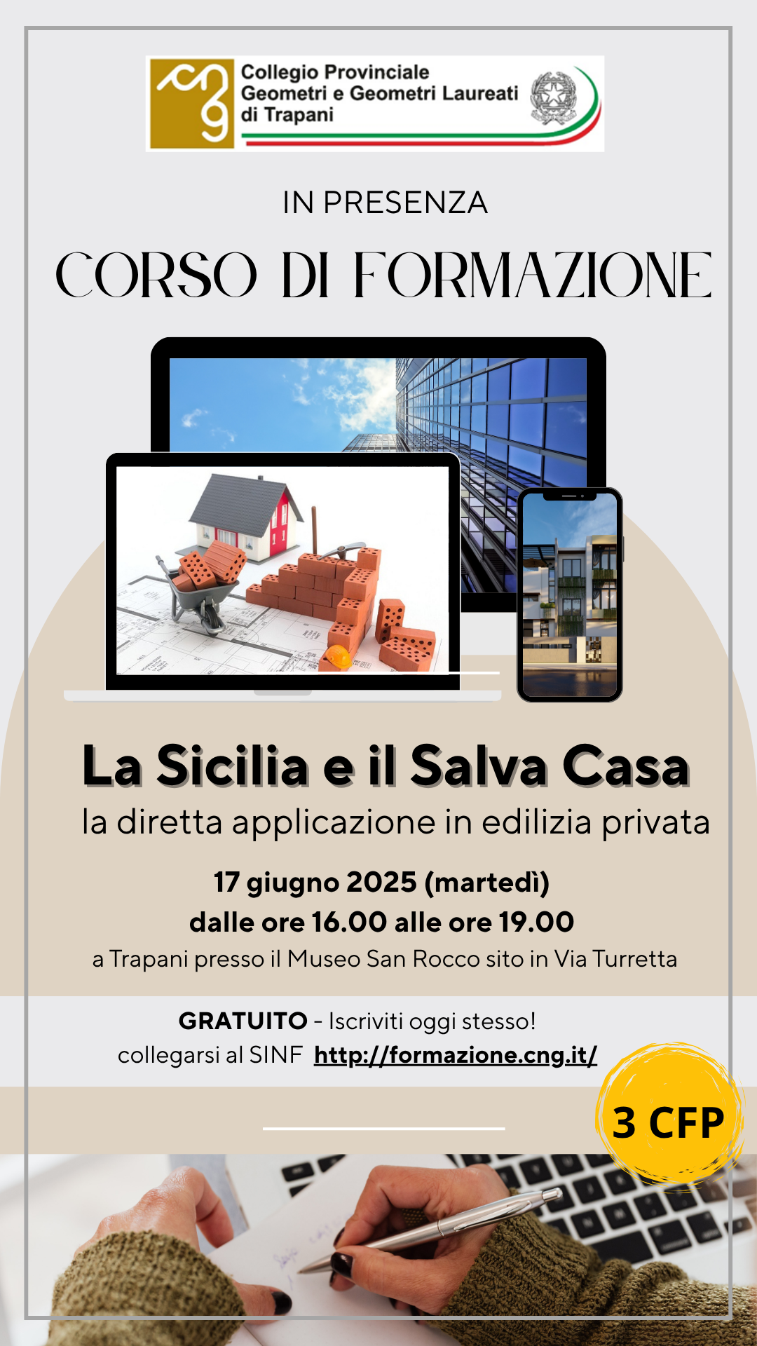 Questo Collegio sta organizzando un corso con i propri iscritti dal tema “la Sicilia e il Salvacasa - la diretta applicazione in edilizia privata” per il giorno 17 giugno 2025 (martedì) dalle ore 16.00 alle ore 19.00 a Trapani presso il Museo San Rocco sito in Via Turretta