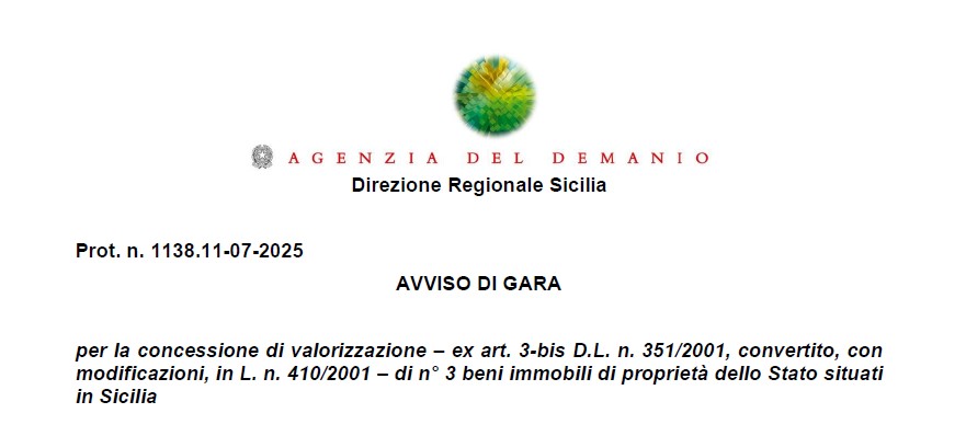 AVVISO PROT. 1138/R.I. DEL 11/07/2025, PER LA CONCESSIONE DI VALORIZZAZIONE EX ART. 3-BIS D.L. N. 351/2001, CONVERTITO, CON MODIFICAZIONI, IN L. N. 410/2001 DI N. 3 BENI IMMOBILI DI PROPRIETĆ DELLO STATO SITI IN SICILIA.
