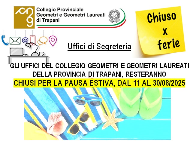 Gli uffici di Segreteria del Collegio Geometri e Geometri Laureati della Provincia di Trapani, resteranno chiusi per la pausa estiva dal 11 al 30/08/2025.