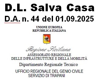 Con nota prot. 101158 del 02/09/2025 dell'Ufficio Regionale Del Genio Civile Servizio Di Trapani a firma dellāIngegnere Capo Giuseppe Alessandro Marino e del Funzionario Responsabile P.O. 28 Geom. Daniele Di Pasquale, p pervenuto il D.A. n. 44 del 01.09.2025 emanato dallāAssessore alle Infrastrutture e alla MobilitĆ avente lo scopo di uniformare le procedure di competenza dei servizi provinciali dellāUfficio Regionale del Genio Civile riguardo allāattestazione di idoneitĆ strutturale degli interventi a corredo delle istanze di regolarizzazione delle costruzioni ai sensi del Titolo IV, Capo II, del DPR 380/2001.