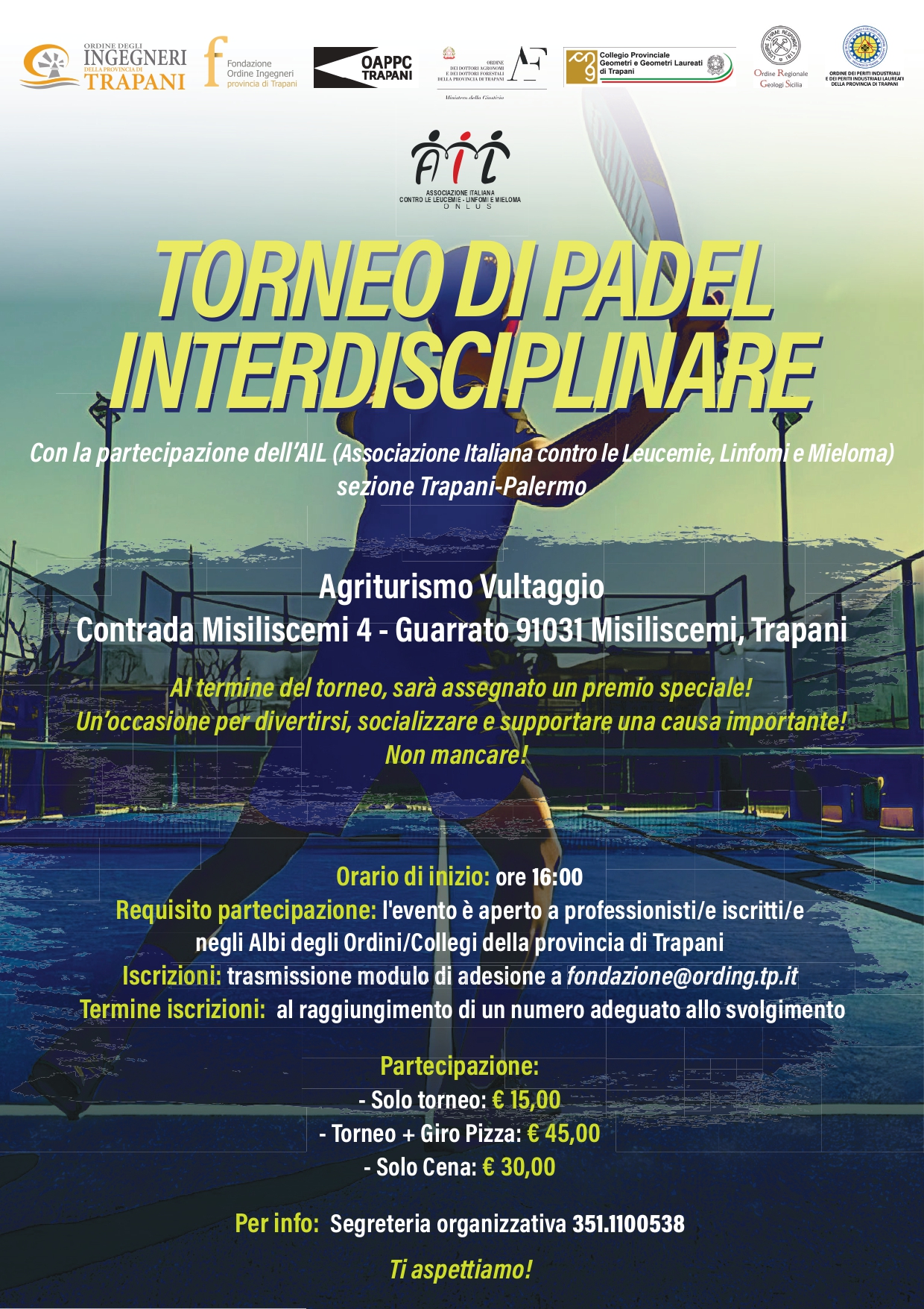 - la Fondazione Ordine Ingegneri Trapani in qualità di Segreteria organizzativa dell’Ordine degli Ingegneri della Provincia di Trapani ha organizzato un torneo di padel interdisciplinare, che vedrà la partecipazione dell’AIL.
