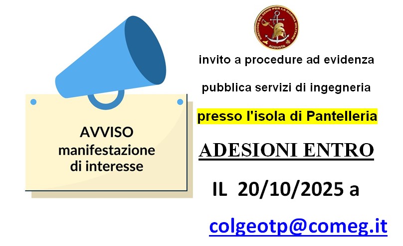 A seguito di comunicazione pervenuta in data odierna per conto della Direzione del Genio per la Marina Militare di Augusta, stazione appaltante operante nell’ambito del codice dei contratti pubblici, trasmetto quanto pervenuto ai possibili interessati residenti o domiciliati nel Comune di Pantelleria che qualora avessero i requisiti e volessero partecipare, di aderire trasmettendo a colgeotp@comeg.it il proprio C.VITAE entro il 20/10/2025