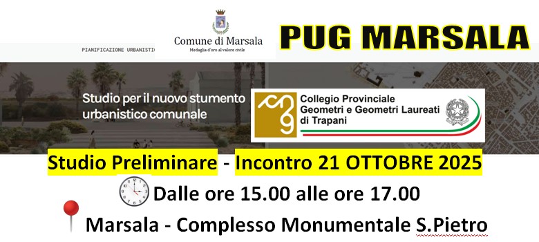 📣 In riferimento allo studio preliminare del piano urbanistico del Comune di Marsala, pervenuto con nota del 25/09/2025 prot. n.0091982, al fine di fornire un contributo tecnico al documento di pianificazione in oggetto, ho invitato tutti i Geometri del Comune di Marsala ad essere presenti il 21 Ottobre 2025 (MARTEDI) dalle ore 15.00 alle ore 17.00 presso la Saletta Multimediale all'interno del Complesso Monumentale San Pietro; ciò al fine di discutere sul preliminare del PUG per cui l’amministrazione del Comune di Marsala ha richiesto un parere al nostro Collegio.
